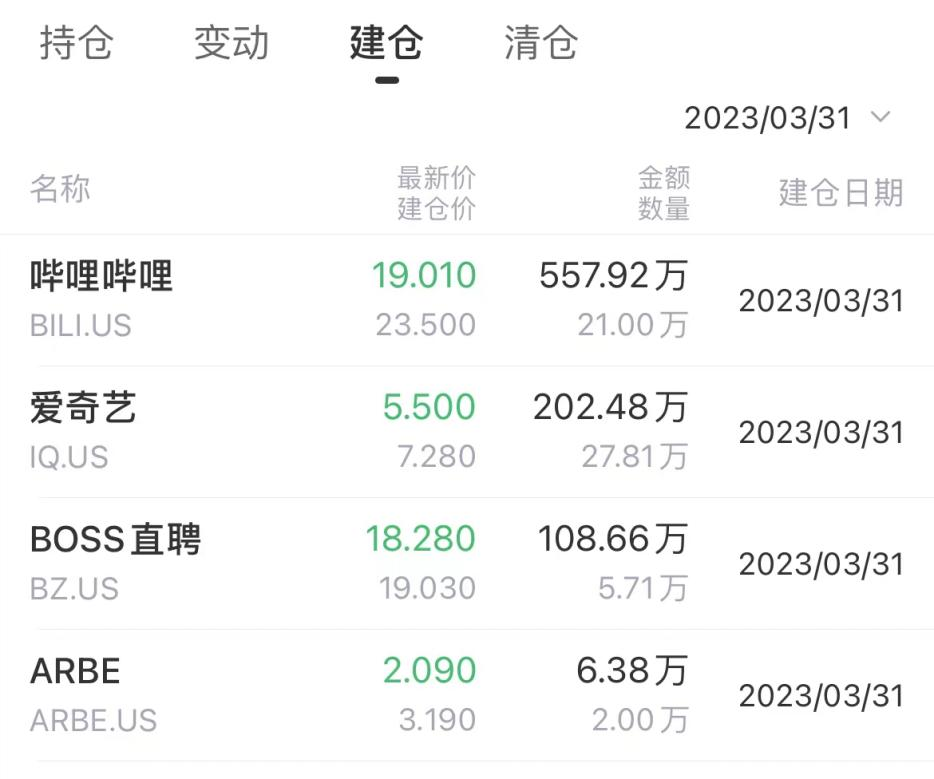 对于第一大重仓股阿里巴巴,TOP ACE增持2.64万股,其持仓市值504.46万美元,占总持仓规模近三分之一。TOP ACE还建仓了哔哩哔哩、爱奇艺、BOSS直聘、ARBE ROBOTICS。这几家公司股价走势较相似,都处在一个相对低位,王亚伟低位建仓,或许是认为中概股已经筑底,开始看好了。
