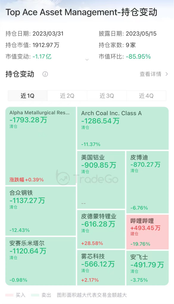 整体来看,Top Ace持仓9家,一季度持仓市值仅1912.97万美元,减少1.17亿美元,市值环比下降85.95%,增持1家,减持3家,建仓5家,清仓36家。