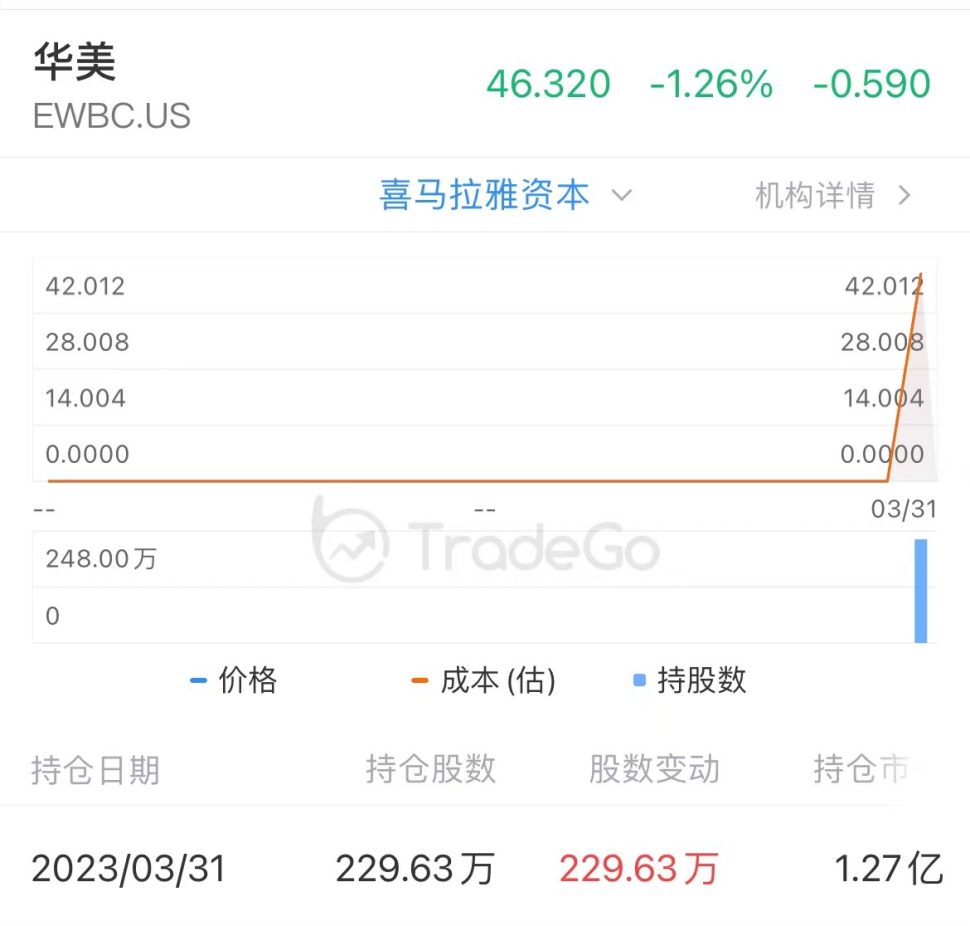 此外,喜马拉雅还建仓了华美银行229.63万股,持仓市值1.27亿美元。