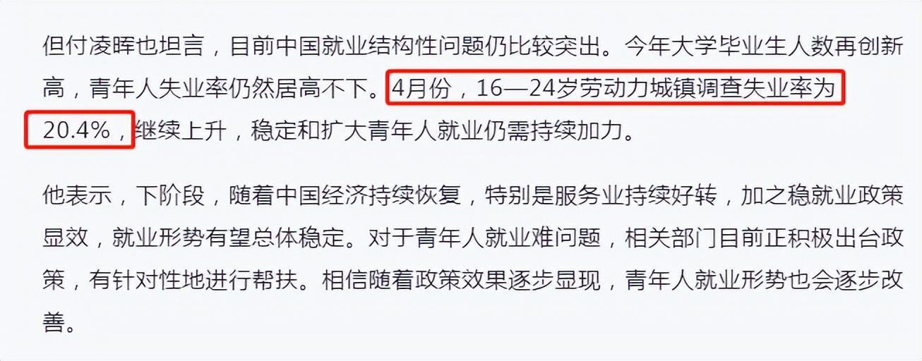 进入2023年后青年失业率一直在提高,1-3月分别为17.3%、18.1%和19.6%,眼瞅着就要突破20%了,结果4月还真的超过了,达到了20.4%。