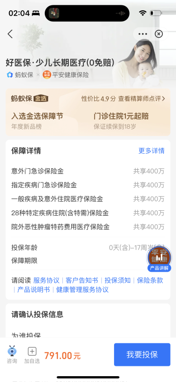 据悉,好医保·少儿长期医疗险是蚂蚁保“金选”新上线的两款产品之一,主承保机构为平安健康,其包含的保障内容有意外门诊保险金、指定疾病门急诊保险金、一般疾病及意外住院医疗保险金、28种特定疾病住院(含特需)保险金以及院外恶性肿瘤特邀费用医疗保险金,共享保障金额400万元。