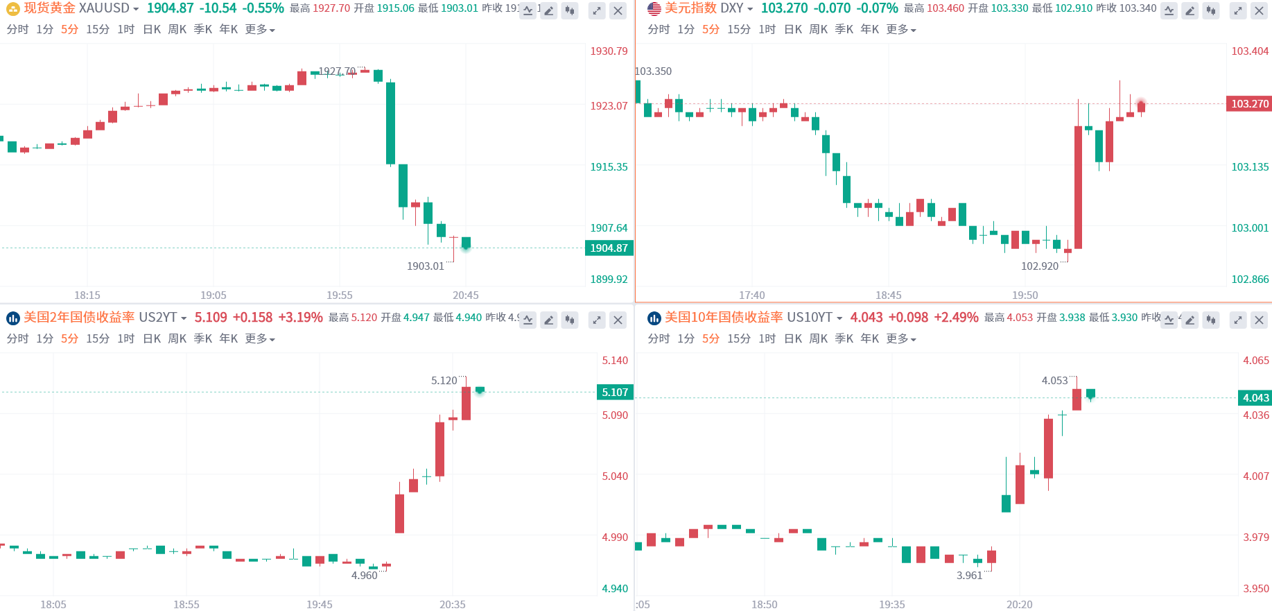 ;白银日内跌超1%;美国两年期国债收益率升破5%,接近2023年的高点;美国10年期国债收益率自三月以来首次上升至4%。
