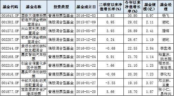 从成立时间来看,上榜产品皆为2015年后成立的产品,且有6只基金为今年才成立的的次新基金。换句话说,超半数的上榜基金都较有效的避开了年初由熔断造成的大跌。