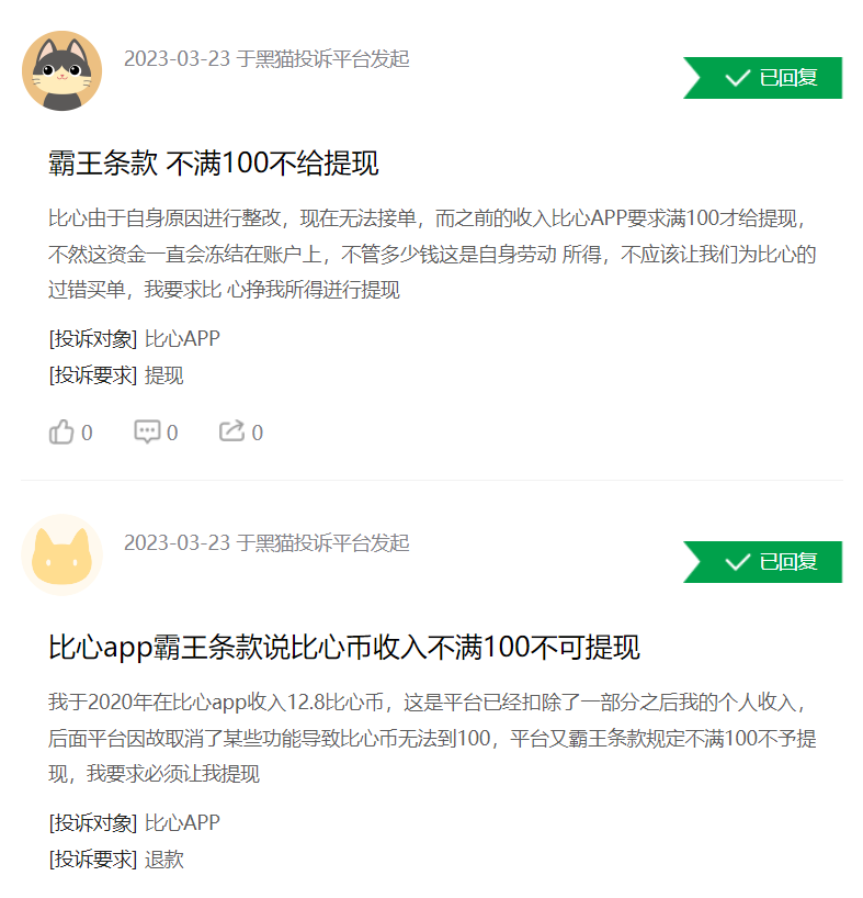 理由:平台设置了“比心币收入提现规则”,对用户提现予以说明解释,具有一定提示作用。针对存在争议的“比心币收入少于100不能提现”规则,平台已关注到但并未予以实质性的核实解决,致使用户投诉积压,质疑升级。