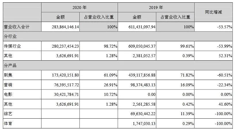 根据公司公开资料,目前华录百纳的主要业务结构为剧集、营销、电影、动漫四大板块。营收方面,以2020年为例,在行业面临疫情黑天鹅之际,去年华录百纳实现营业总收入2.84亿元,同比下降53.57%,归属于上市公司股东的净利润为1.12亿元,较前一年同比下降仅1.31%。