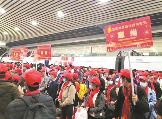 羊城晚报全媒体记者周聪,通讯员粤仁宣、穗人社宣摄影报道:“广东,我们回来了!”21日14时47分,从贵州省毕节市始发的D2811次专列抵达广州南站。613名毕节市务工人员走出出站口。20日20时17分,600多名云南籍务工人员乘坐D4856次列车也已到达广州南站。