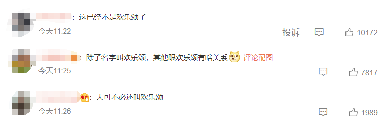 开播第二天,“欢乐颂 尴尬”就登上热搜第一位。其中吐槽声最大的就是认为这部剧的故事和人物都与之前的《欢乐颂》无关,有种蹭前两部《欢乐颂》热度的“嫌疑”,不如直接改名。有网友评论:“大可不必还叫欢乐颂”、“除了名字叫欢乐颂,其他和欢乐颂还有啥关系”。