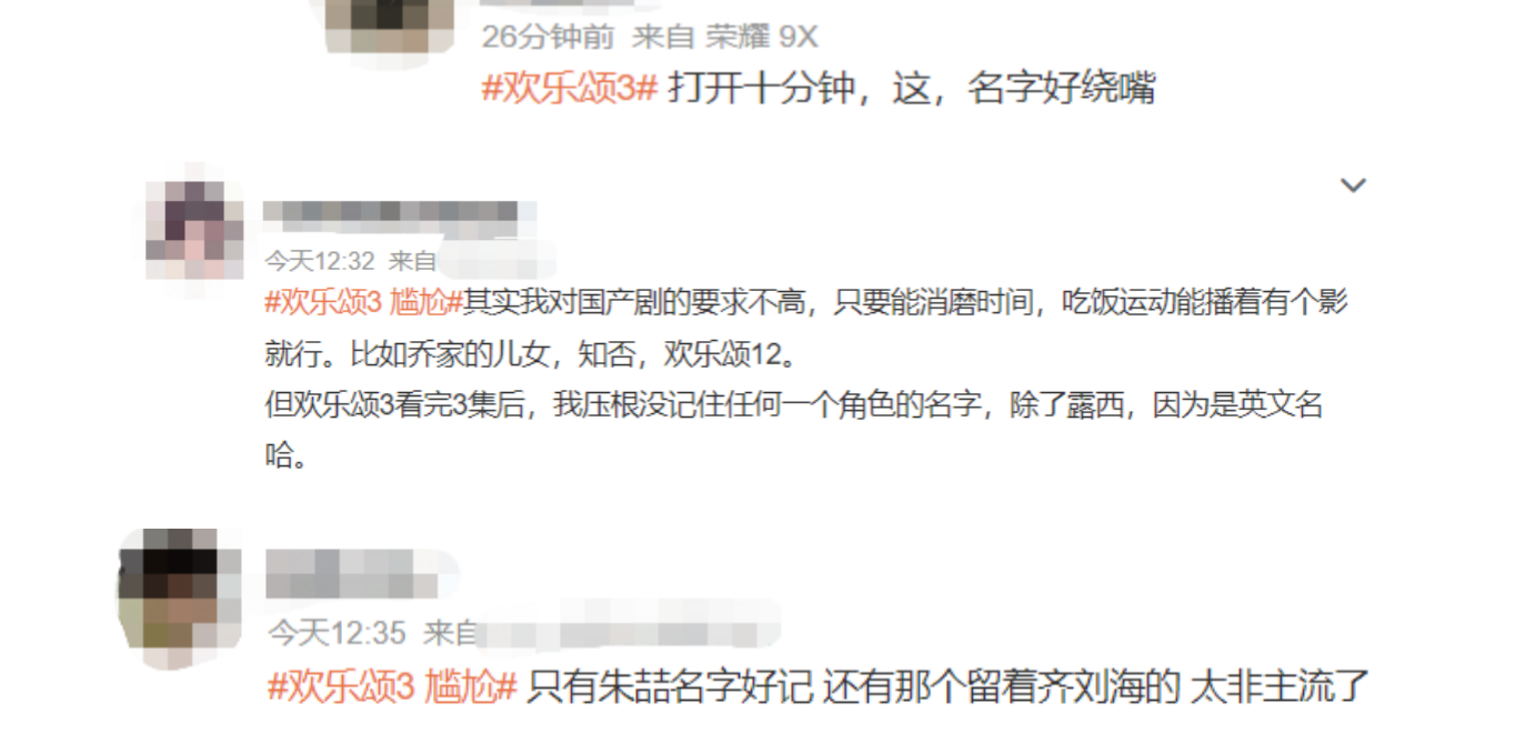 其次,观众们对主角的名字也表示:“太难记了!”、“名字好绕嘴”。剧中“五美”名字分别为:叶蓁蓁、方芷衡、朱喆、何悯鸿、余初晖。相比《欢乐颂1》,“安迪”英文简洁明了,“樊胜美”十分接地气,“曲筱绡”、“邱莹莹”都是叠词,简单好记。唯一复杂一点的“关雎尔”则是来自大家都知道的“关关雎鸠,在河之洲,窈窕淑女,君子好逑”。虽然《欢乐颂3》中女主角的名字都很好听,但在人物丰富的电视剧中,这些“小说女主角一般”的名字,让观众在看剧时还是有些“糊涂”。有网友称:“除了朱喆,其他一个字都记不住!”