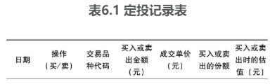 4.做好定投记录在记录定投信息的时候,主要需要记录的是:定投的时间、定投的操作(买/卖)、定投买入或卖出的品种、定投买入或卖出的总金额、成交的基金份额数量、买入或卖出的估值。可制作“定投记录表”如表6.1所示。