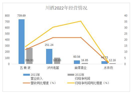 具体来看,五粮液仍稳坐川酒企业第一的宝座,其在2022年实现营收739.69亿元,是泸州老窖、舍得酒业、水井坊营收总和的2倍,该公司266.91亿元的归母净利润同样也超过上述三家的总和。