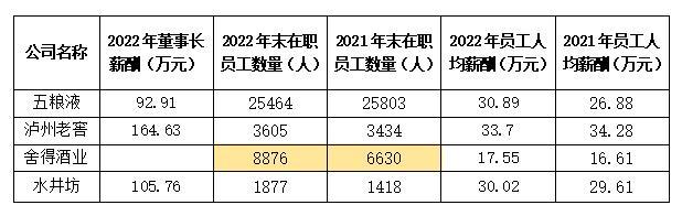 董事长薪酬方面,2022年,泸州老窖董事长刘淼、水井坊董事长范祥福的薪酬分别为164.63万元、105.76万元,而五粮液董事长曾从钦自2022年5月27日起任职,其任职六个月的年薪为92.91万元。舍得酒业倪强自2023 年1月起担任董事长职务,2022年未有董事长职务的年薪。