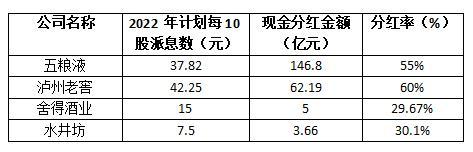 现金分红方面,上市的四家川酒企业均发布了2022年的利润分配方案。五粮液计划2022年向全体股东每10股派现金37.82元,共计分配现金146.8亿元;泸州老窖计划每10股派发现金红利42.25元,现金分红62.19亿元;舍得酒业计划每10股派发现金股利15元,现金分红约5亿元;水井坊计划每10股派7.5元,现金分红3.66亿元。
