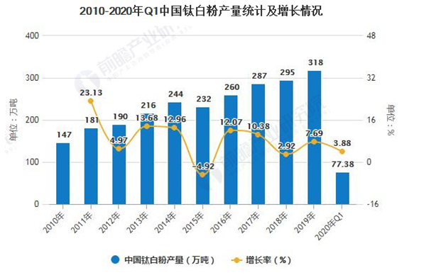 2020年随着新增产能释放,加之新建产能投产,2020年3月中国钛白粉产量为29.24万吨,同比增长约7万吨,同比增长35.49%,同比增长6.74%。累计方面,2020年第一季度,中国钛白粉产量达到77.38万吨,累计增长3.88%。一季度,受疫情影响,部分企业生产受到较大影响,市场新增产能释放,整体产量增加。