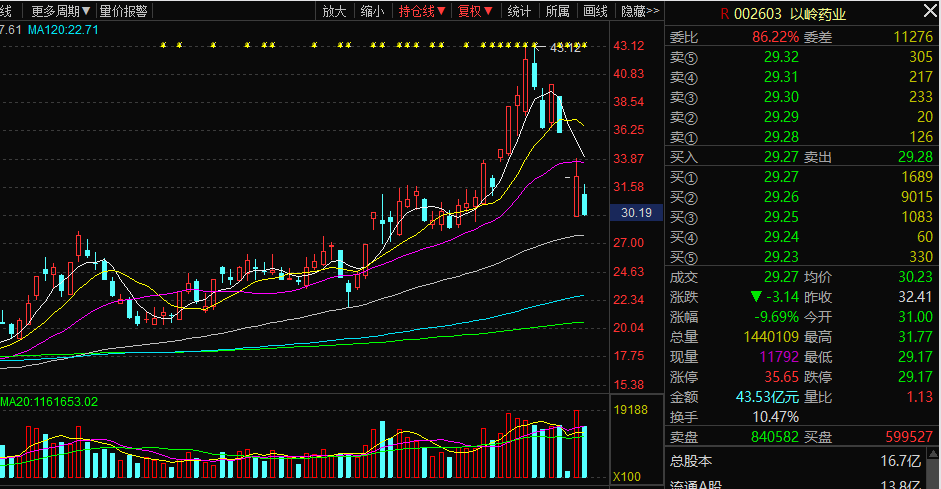 今日,以岭药业股价继续放量下跌,盘中多次触及跌停,最后报收29.27元,下跌9.69%,换手率10.47%,成交量144.01万手,成交额43.53亿元。