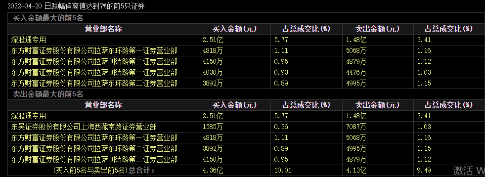 4月15日,盘后龙虎榜数据显示国泰君安上海分公司卖出近5亿元,中金公司上海分公司卖出2亿元,一机构卖出7012万元。