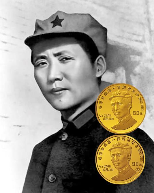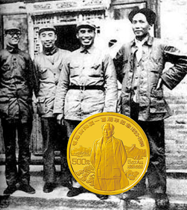 ▲此图为1936年长征时期的毛泽东;纪念币为1993年-毛泽东诞辰100周年金银纪念币1/2盎司圆形金质纪念币(中国国内版)和1/2盎司圆形金质纪念币(中国海外版)的背面图案。内容选用长征时期的青年毛泽东形象,其中1/2盎司圆形金质纪念币(中国海外版)刊有带圈S的特色标记。