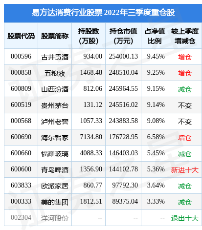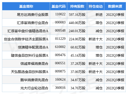 根据2022Q3季报公募基金重仓股数据,重仓该股的公募基金共34家,其中持有数量最多的公募基金为易方达消费行业股票。易方达消费行业股票目前规模为300.9亿元,最新净值3.466(10月26日),较上一交易日下跌0.17%,近一年下跌25.37%。该公募基金现任基金经理为萧楠 王元春。萧楠在任的基金产品包括:易方达瑞恒灵活配置混合,管理时间为2018年1月10日至今,期间收益率为147.3%;易方达科顺定开混合,管理时间为2018年10月26日至今,期间收益率为63.66%;易方达消费精选股票,管理时间为2020年4月13日至今,期间收益率为-21.09%。王元春在任的基金产品包括:易方达瑞恒灵活配置混合,管理时间为2018年12月8日至今,期间收益率为223.27%;易方达现代服务业混合,管理时间为2018年12月8日至今,期间收益率为99.22%;易方达标普消费品指数A,管理时间为2021年5月29日至今,期间收益率为-17.41%。