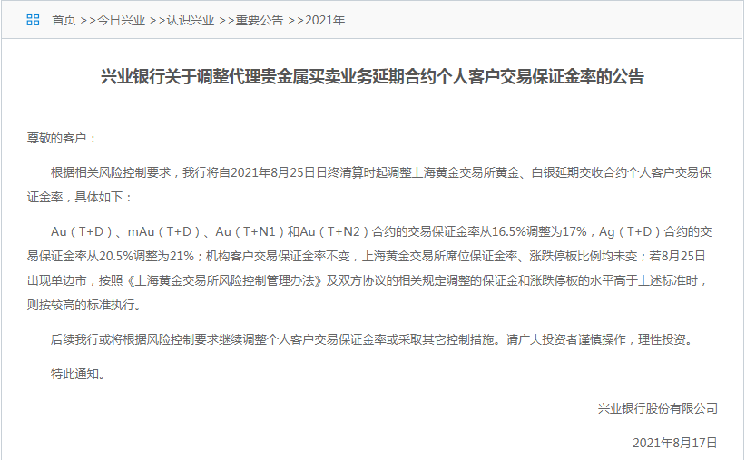 8月17日,兴业银行在官网公告,根据相关风险控制要求,将自2021年8月25日日终清算时起调整上海黄金交易所黄金、白银延期交收合约个人客户交易保证金率。