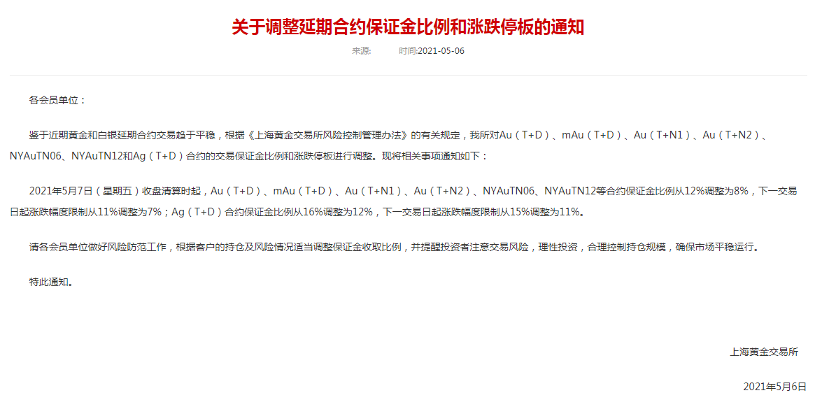 今年5月7日,上海黄金交易所(下称“上金所”)发布了调整延期合约保证金比例及涨跌停板的通知,对前述交易品种的保证金比例和涨跌幅度进行下调。上金所表示,各会员单位可根据客户的持仓及风险情况适当调整保证金收取比例。