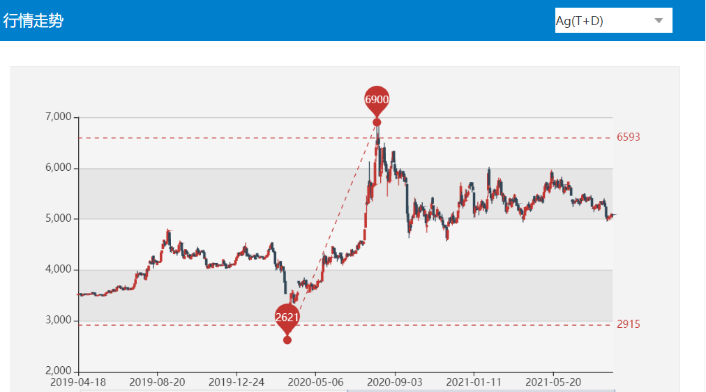 从行情来看,上述合约品种自去年8月份左右以来走势震荡,其中Ag(T+D)从去年3月的2621点直线冲高至8月的6900点,涨幅高达163%,随后震荡下行,当前报5092点。而Au(T+D)、mAu(T+D)、Au(T+N1)、Au(T+N2)也自去年8月份起开启跌势,至今均跌超百点以上。